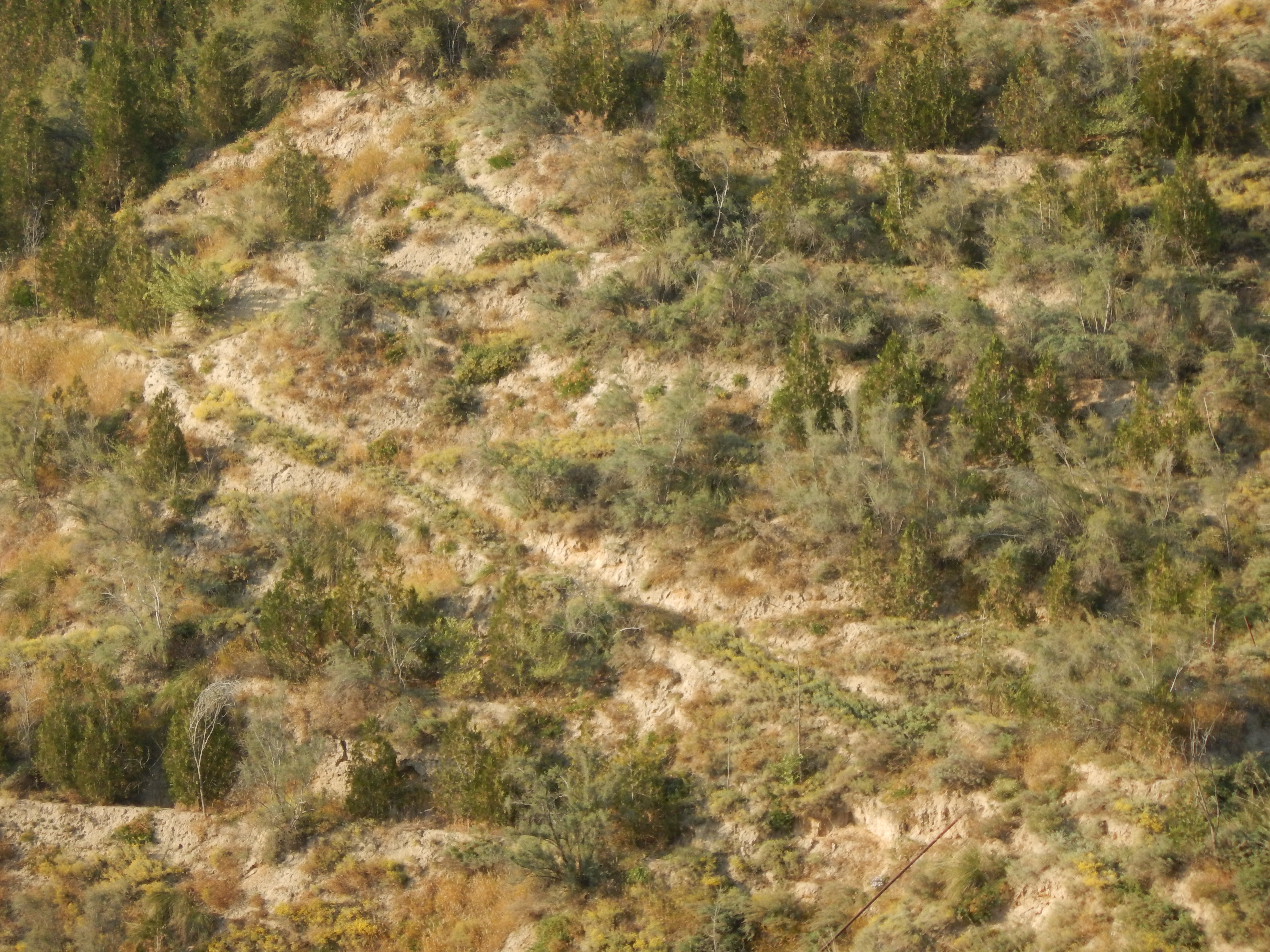 植栽地一帯の土質は黄土です。黄土は中国西北部の黄河上流域から発生する黄砂が長年にわたり降り積もり圧密固結したもので、場所によっては深さ100メートル以上も堆積しています。シルト質で、通常は固いが、水には簡単に浸食され、一旦崩れると粉状になって飛び散りやすいとされています。本県の鹿角、北秋田地区に分布するシラス土壌に性質が似ています。また、蘭州市の降水量は年間250ミリほどで本県の1/7に過ぎませんが、夏の雨季には黄土の浸食を引き起こす強い雨も降るようです。