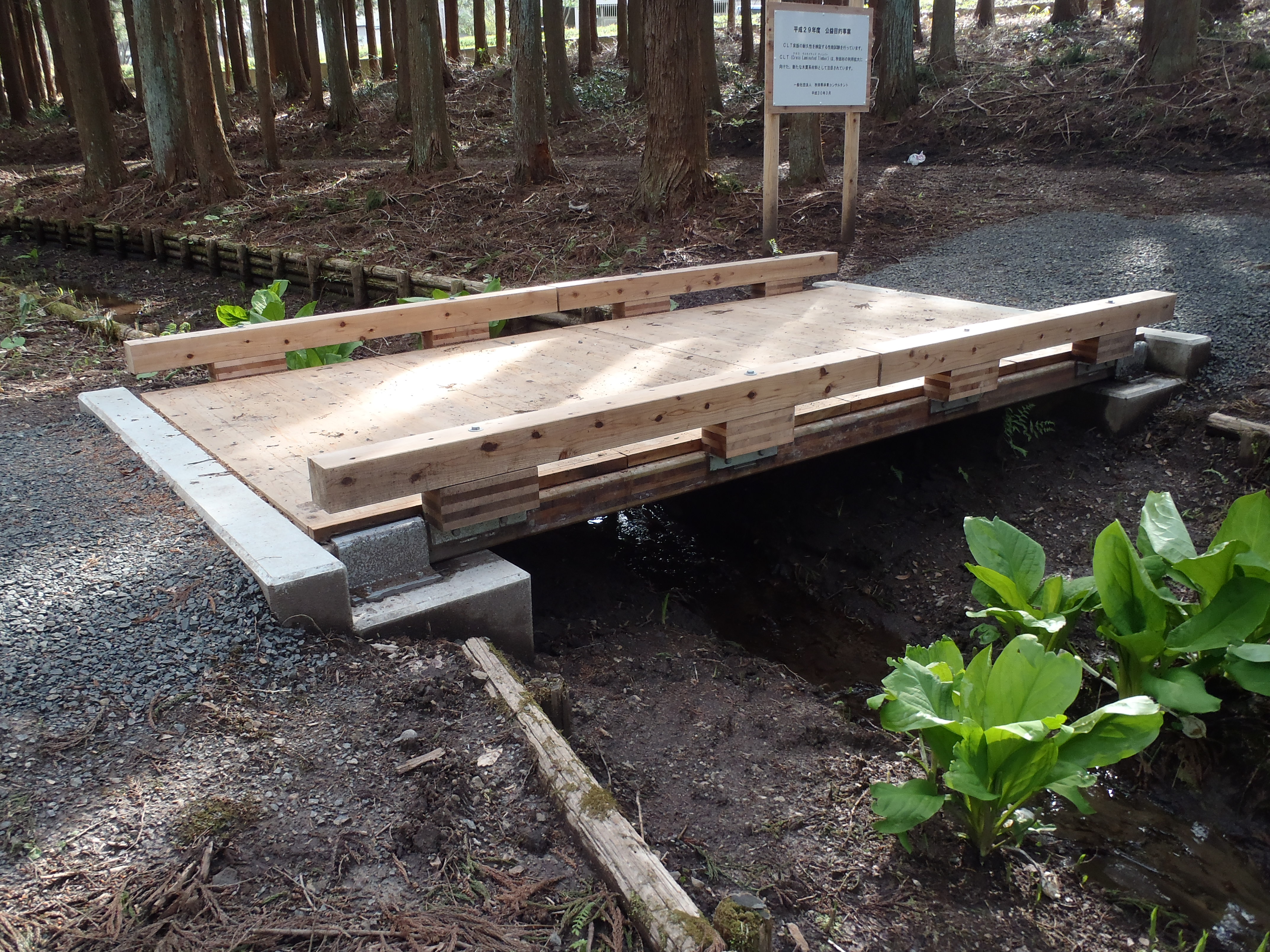 「学習交流の森」 では、2基の床版が、それぞれ3×1m、4×1mで、厚さは、いずれもラミナ厚2.4cmの5層で計12cmです。3m橋には防虫剤を使用し、4m橋にはFRPラッピング処理を行い防腐薬剤は塗っていません。