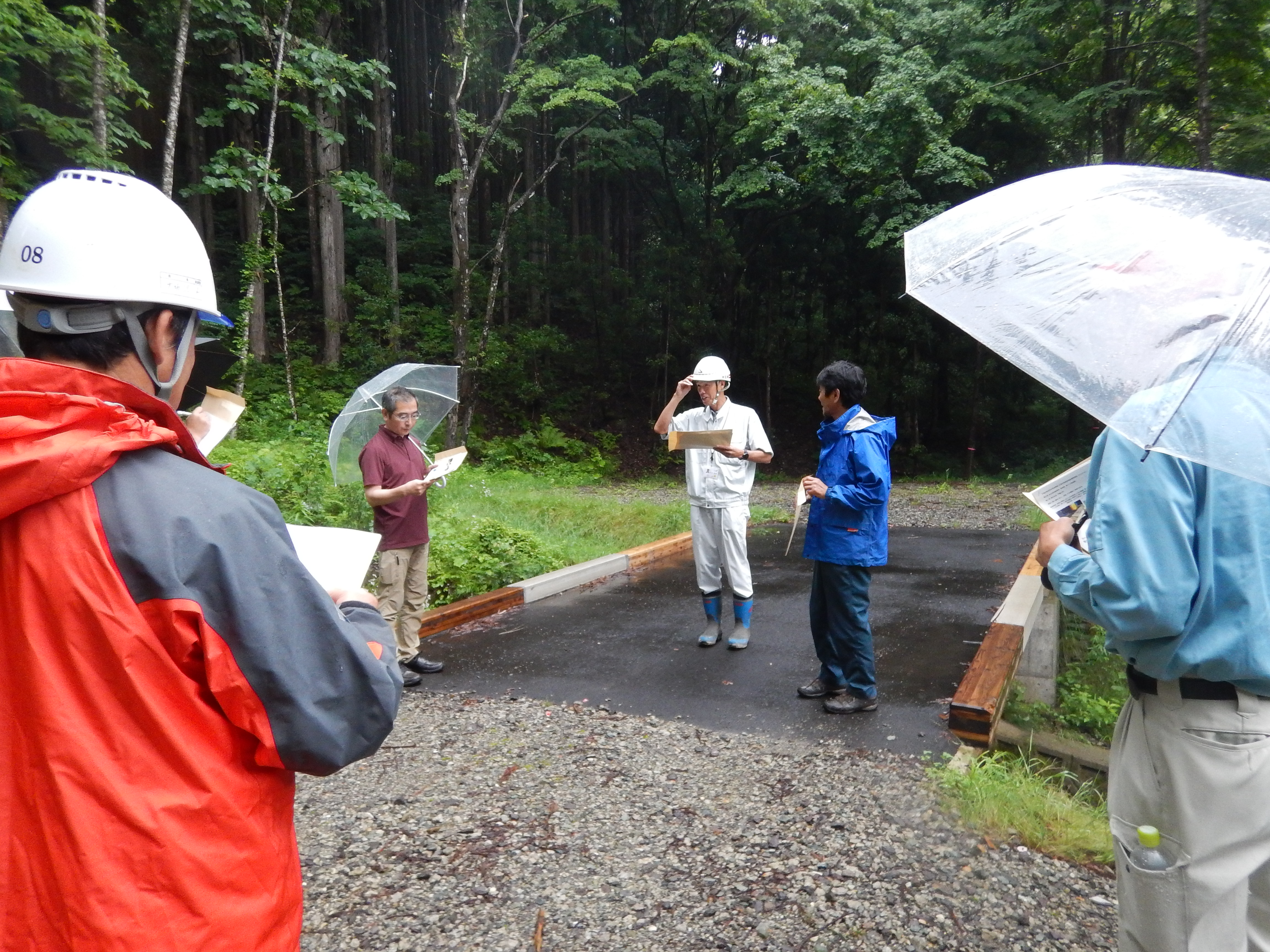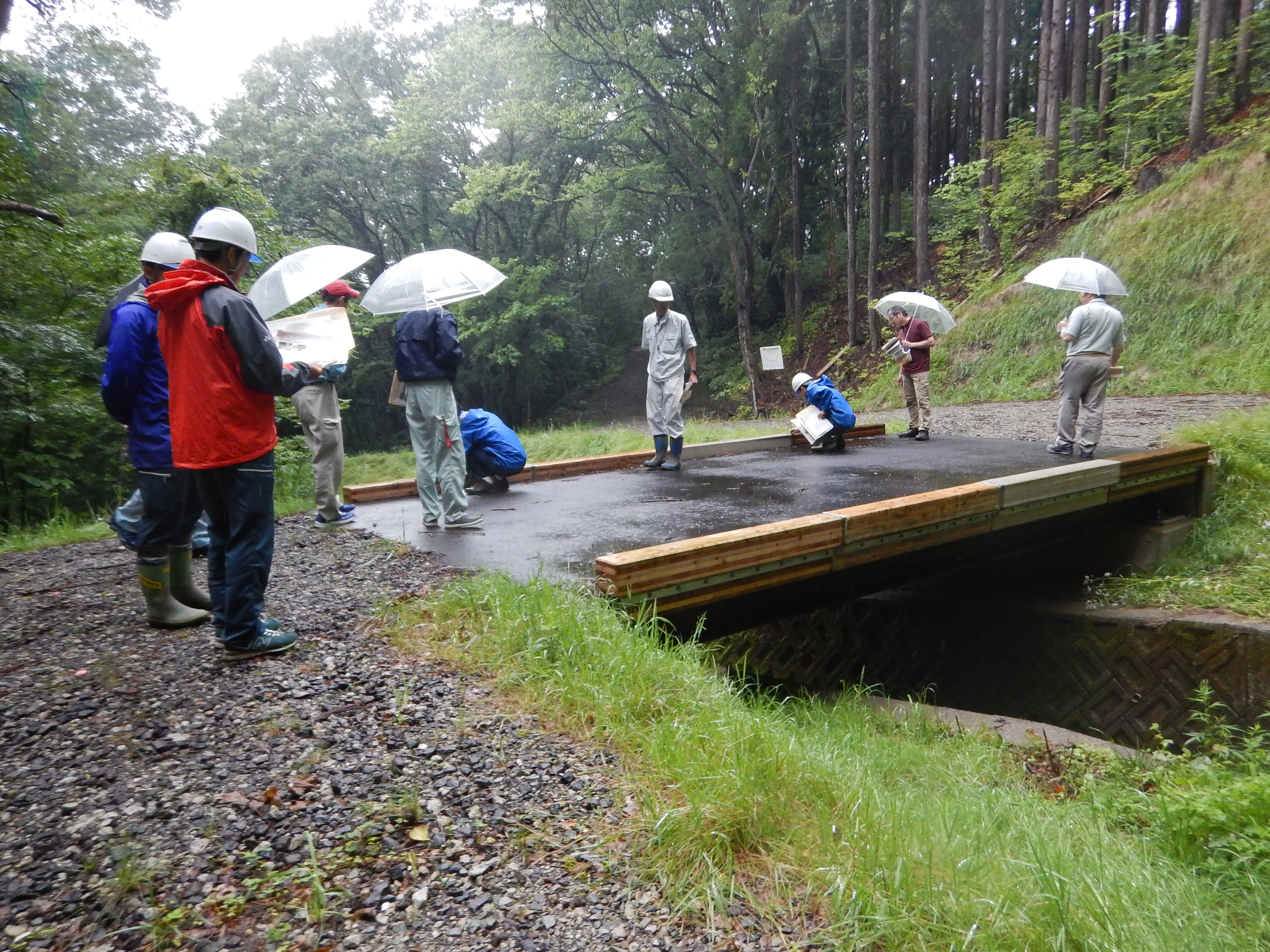 7月12~13日、青森、岩手、秋田、福島各県の森林土木コンサルタント職員の技術研修が仙北市田沢湖町で行われました。当日は、あいにくの雨の中、各県から13名が参加し、秋田駒ヶ岳の土石流対策や木材使用の橋梁について研修しました。